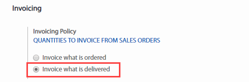 Để lập hóa đơn dựa trên số lượng đã giao bạn vào ứng dụng Inventory (Tồn kho), trên menu chọn Configuration (Cấu hình) > Settings (Thiết lập) > tab invoicing (Hóa đơn) > chọn Invoice what is delivered (Xuất hóa đơn theo hàng đã giao)