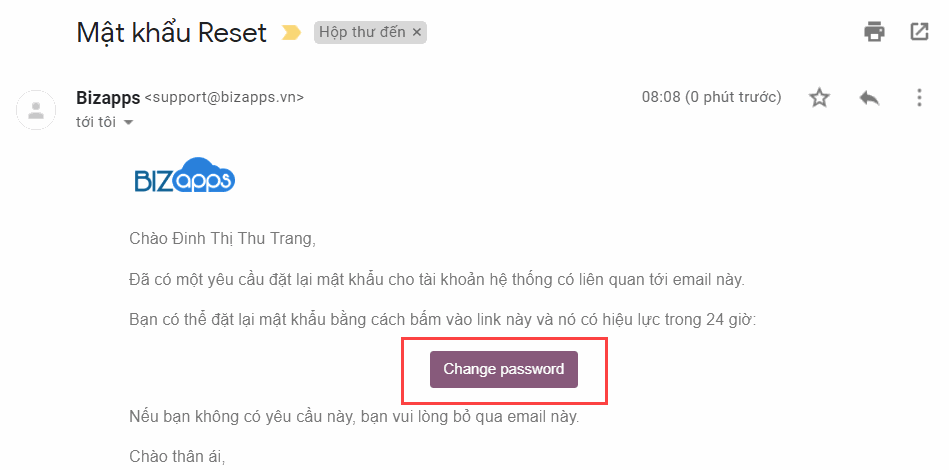 Bước 3: Kiểm tra hộp thư đến email của bạn và click vào Change password