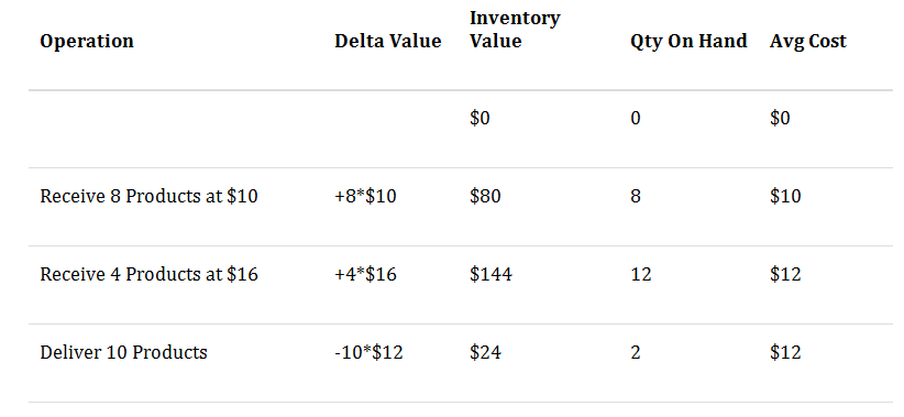 Theo mặc định, khi 10 sản phẩm được giao đi thì giá bình quân cũng không thay đổi. Thật vậy, giá trị tồn kho hiện tại là $24 vì chúng ta chỉ có 2 đơn vị còn lại cho mỗi $24 / 2 = $12.