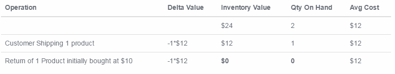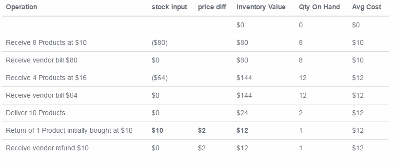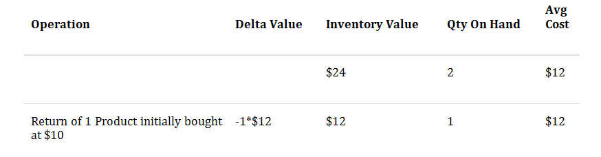 Trong trường hợp một sản phẩm được trả về cho nhà cung cấp, giá trị tồn kho được giảm nhờ công thức tính giá bình quân (không phải giá ban đầu của những sản phẩm đó). Điều này có nghĩa rằng, bảng phía trên sẽ được cập nhật như sau: