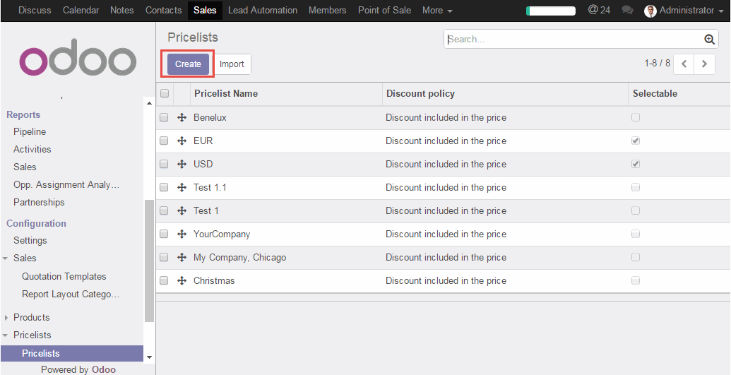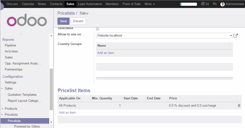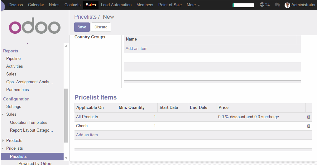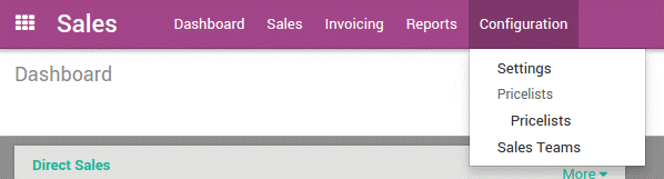 Một khi các thiết lập đã được áp dụng thì menu Pricelists (Bảng giá) sẽ xuất hiện bên dưới menu Configuration (Cấu hình) trong phân hệ Sale (Bán hàng)