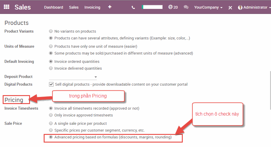 Tích chọn vào dòng Advanced pricing based on formula trong phần Pricing