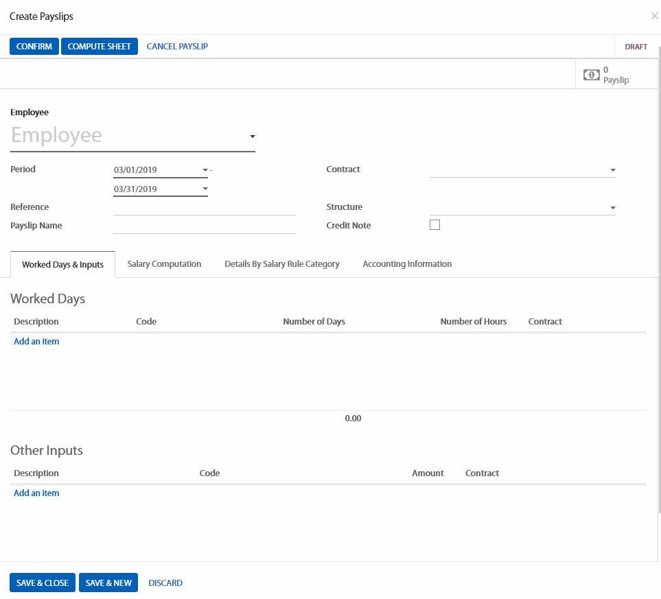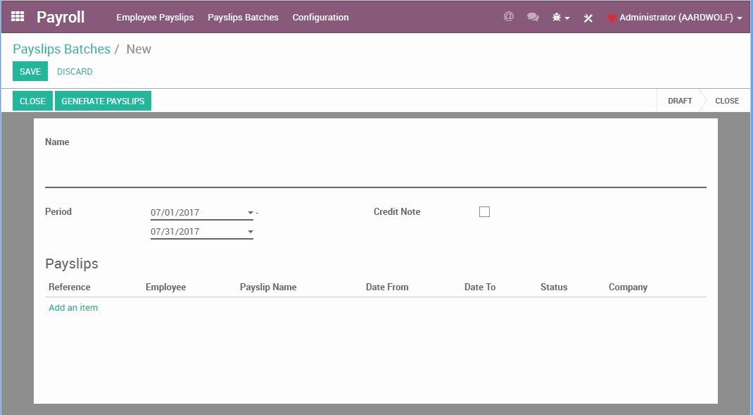 Sử dụng trình đơn Payroll (Bảng lương) > Payslips Batches (Bảng lương), bạn có thể tạo phiếu lương cho nhiều nhân viên khác nhau tại một thời điểm. Nó giống như một nơi tập hợp các phiếu lương các nhân viên khác nhau được tạo ra thông qua Tạo phiếu lương tự động.