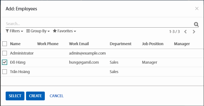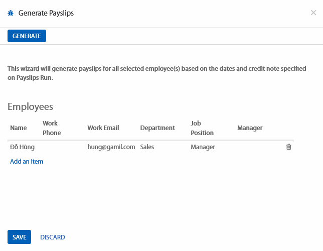 Nhấp chuột vào nút tạo sẽ cho phép bạn chọn các nhân viên mà bạn muốn tạo ra phiếu lương.