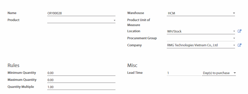 Vào Inventory (Tồn kho) > Masters Data (Dữ liệu gốc) > Reordering Rules (Quy tắc tái cung ứng). Chọn vào Create (Tạo) để đặt các giá trị hàng hóa tối thiểu và tối đa cho một sản phẩm nhất định.