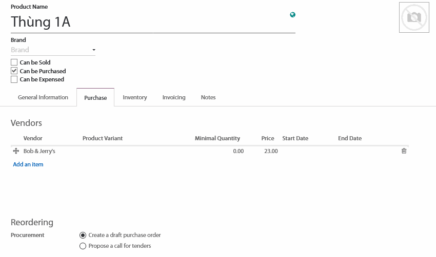 Chọn sản phẩm tại trường product và chọn nhà cung cấp trong tab Purchase (Mua hàng)