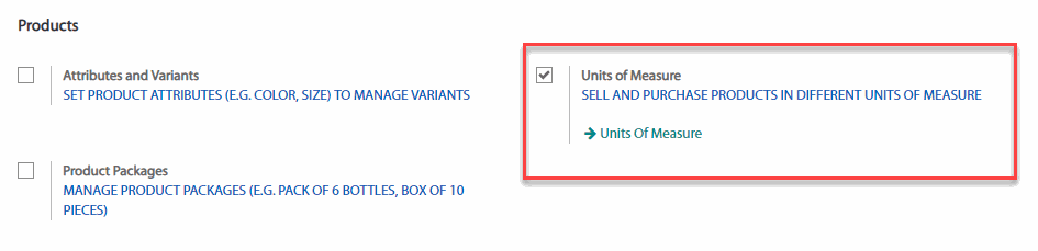 Trong ứng dụng Inventory (Quản lý hàng tồn kho), vào Configuration > Settings (Cấu hình > Thiết lập). Trong mục Products (sản phẩm), bạn nhấn chuột chọn vào ô Units of Measure (Đơn vị đo lường), sau đó nhấn nút SAVE (LƯU).