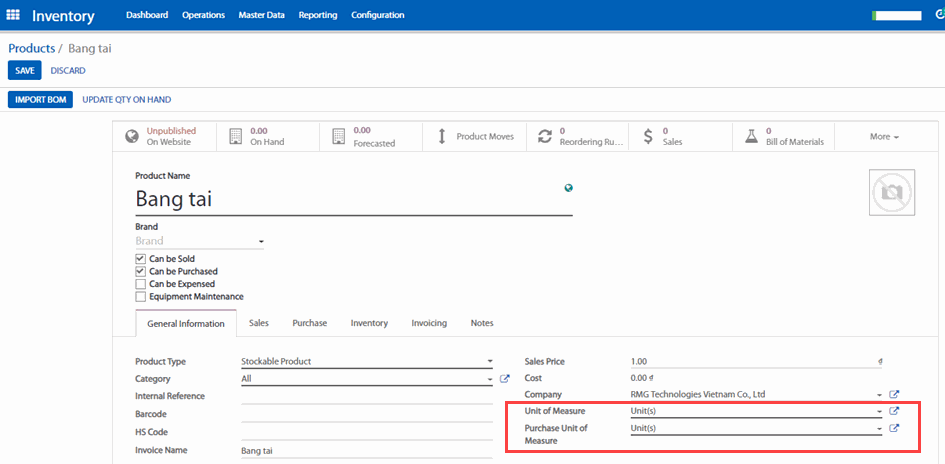 Trong ứng dụng Inventory (Quản lý hàng tồn kho), vào Master Data > Products (Dữ liệu gốc > Sản phẩm), chọn sản phẩm bạn cần thay đổi đơn vị đo mua/bán, sau đó nhấn nút EDIT (SỬA).