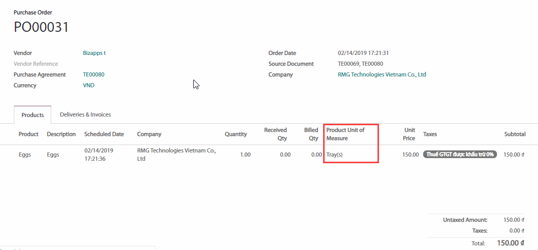 Đơn vị đo cũng có thể thay đổi trong đơn mua hàng