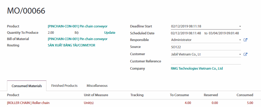 Sau đó chọn Save (Lưu) thì hệ thống sẽ tự động đổ các dữ liệu từ BOM ra các tab Consumed material (Nguyên vật liệu).