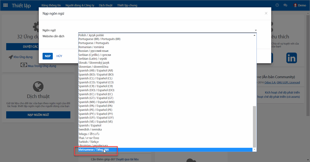 Sau khi bạn chọn được ngôn ngữ bạn muốn. Bấm nút Load (Nạp) để hệ thống tiến hành đưa ngôn ngữ vào