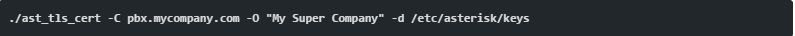 • Tạo chứng thực DTLS (thay thế pbx.mycompany.com bằng ip địa chỉ ip của bạn hoặc dns, thay thế My Super Company bằng tên công ty của bạn):