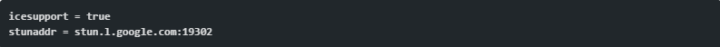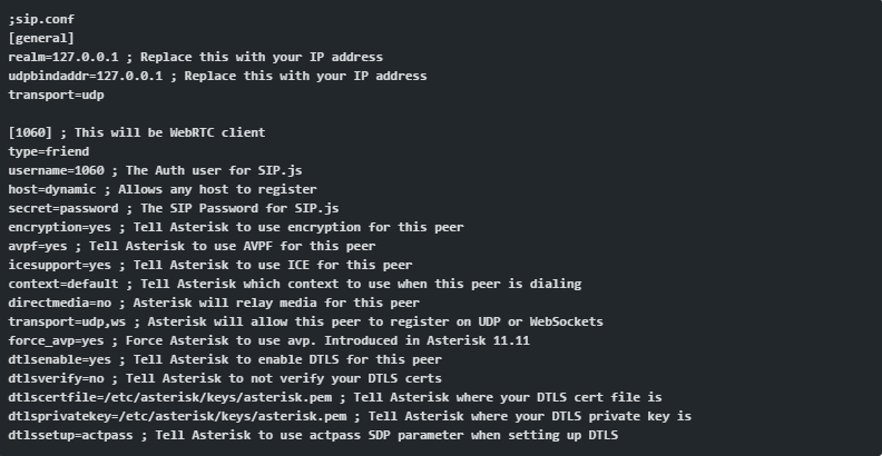 Tiếp theo, chỉnh sửa sip.conf. WebRTC peer yêu cầu mật mã, avpf và icesupport được kích hoạt. Trong hầu hết trường hợp, directmedia nên được vô hiệu hóa. Trong cung mục khách hàng WebRTC, các di chuyển cần phải được liệt kê là 'ws' để cho phép các kết nối websocket. Tất cả những dòng cấu hình này nên ở ngang cấp với chính nó, thiết lập những dòng cấu hình chung có thể không làm việc được: