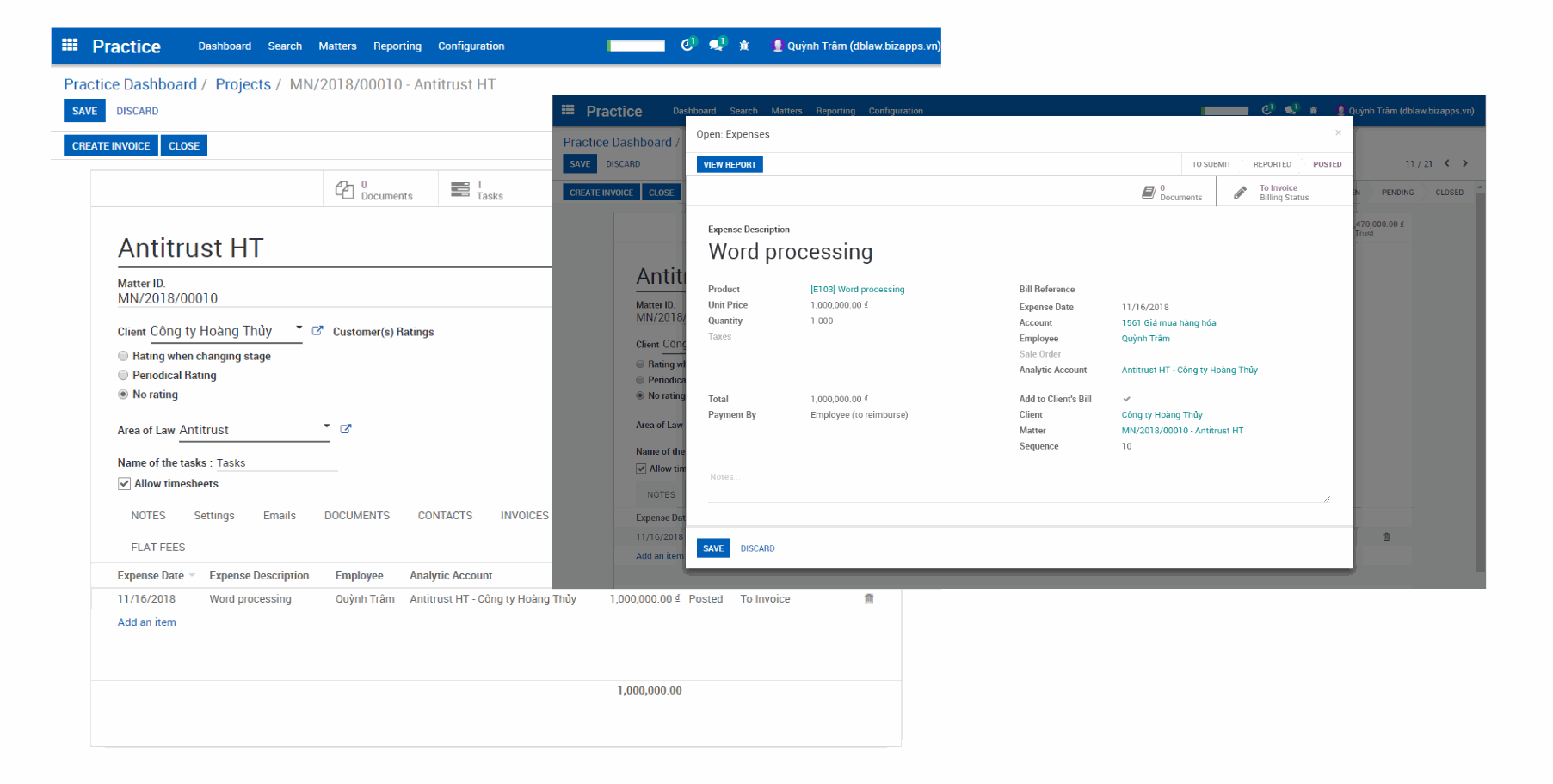 • Trong thông tin matter: Vô tab Expenses và click “Add an Item”.