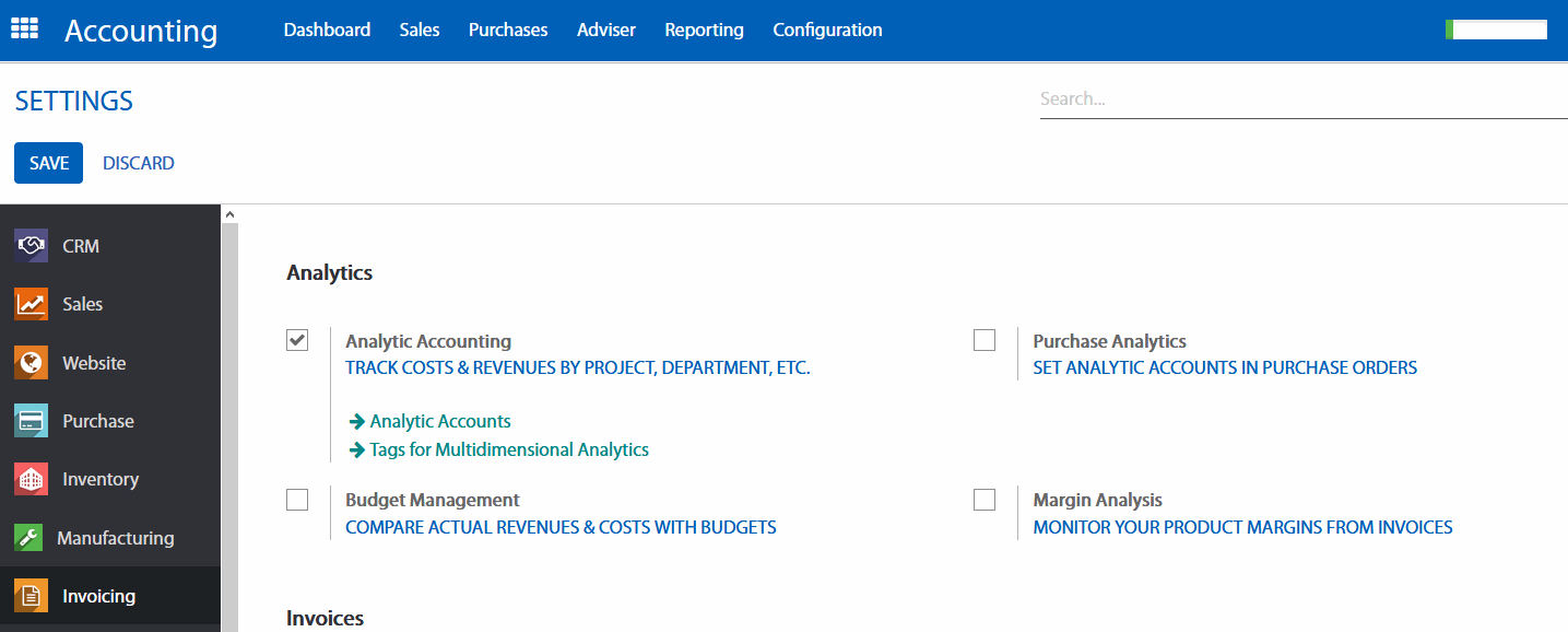 Kế tiếp, bạn cần kích hoặc Kế toán quản trị. Để làm được điều này, đi đến Accounting app. Chọn Configuration (Cấu hình) > Settings (Thiết lập) và nhấp vào tùy chọn Analytic accounting (xem hình bên dưới).