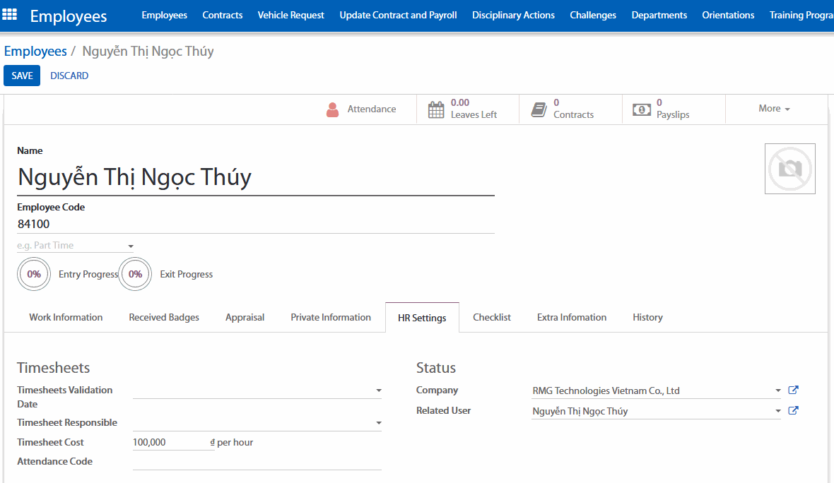 Trong bảng nhân viên, đi đến tab HR setting (Thiết lập thông tin nhân sự). Tại đây, bạn sẽ có thể quy định Timesheet Cost (chi phí thời gian) cho nhân viên của bạn. Trong trường hợp này Nguyễn Thị Ngọc Thúy được tính phí 100000 VND/ giờ. Vì thế, chúng ta sẽ điền vào trường này là 100000.