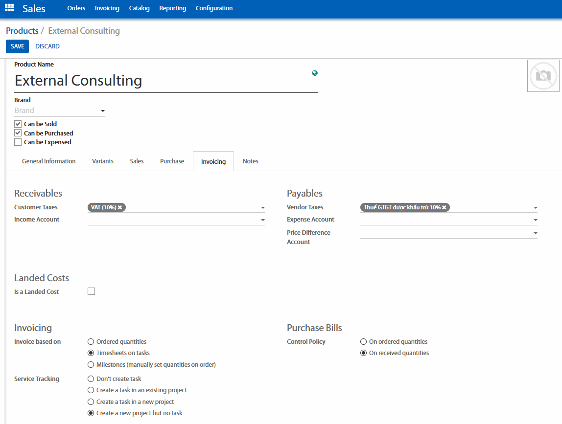 Vì thế, cần tạo Đơn bán hàng cho sản phẩm là một dịch vụ được lập hóa đơn dựa trên thời gian và nguyên vật liệu. Được kiểm soát thông qua nhật ký công việc với đơn vị ghi nhận là giờ làm việc.