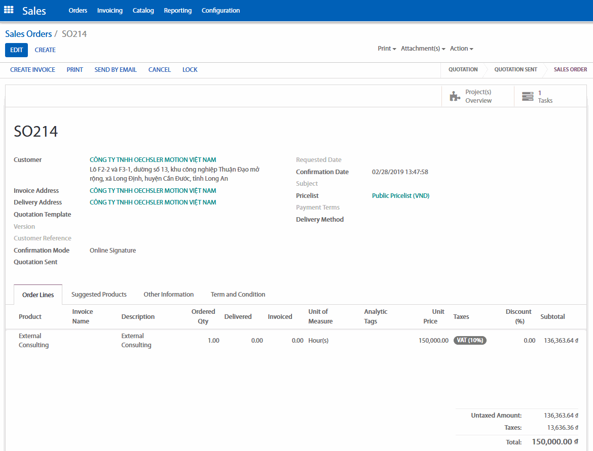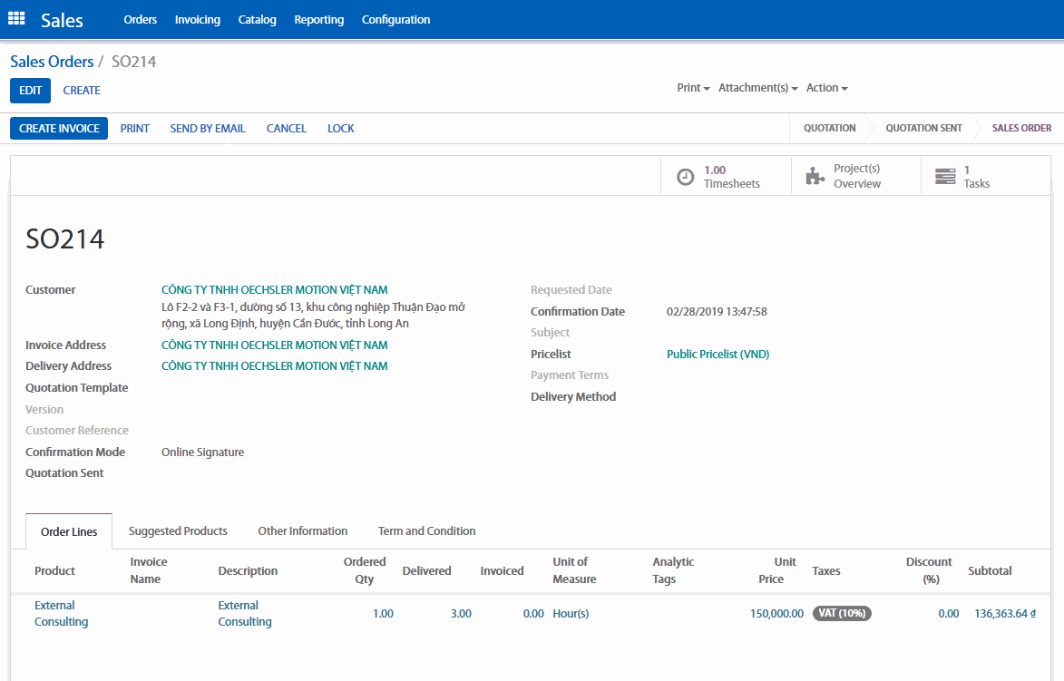 Khi đơn hàng đã được xác nhận sẽ tạo ra dự án tương ứng cho đơn hàng, vào tạo task nhập vào thời gian làm việc tương ứng