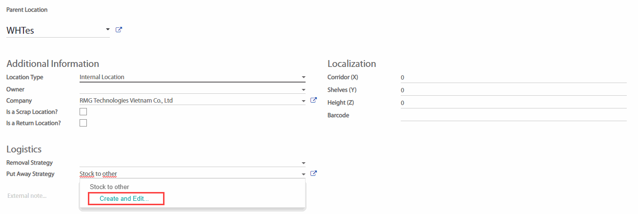 Mở menu roll-down và nhấp vào Create and Edit ... (Tạo và chỉnh sửa...). Một màn hình biểu mẫu của chiến lược put away sẽ được mở ra, tại đây bạn cần đặt tên cho chiến lược và thiết lập phương thức và địa điểm cố định cho mỗi chiến lược, Nếu muốn bạn có thẻ tạo thêm địa điểm mới.