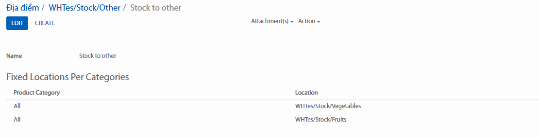Giả sử rằng có một địa điểm kho là WH/Stock và một địa điểm phụ là WH/Stock/Vegetables & WH/Stock/Fruits.