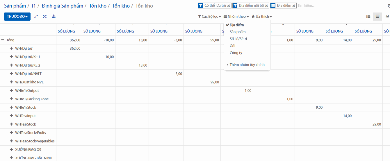 Tại đây bạn có thể xem tồn kho hiện tại theo địa điểm
