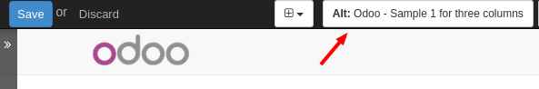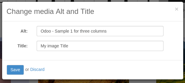 Khi bạn nhấp vào một hình ảnh, Odoo sẽ hiển thị cho bạn các thuộc tính và thẻ <img>. Bạn có thể nhấp vào nó để thiết lập tiêu đề của riêng bạn và các thuộc tính Alt cho hình ảnh.