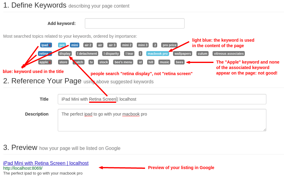 Mỗi trang web phải xác định dữ liệu meta <title>, <description> và <keywords>. Các yếu tố thông tin này được các công cụ tìm kiếm sử dụng để xếp hạng và phân loại trang web của bạn theo một truy vấn tìm kiếm cụ thể. Vì vậy, điều quan trọng là phải có tiêu đề và từ khoá phù hợp với những gì mọi người tìm kiếm trong Google.