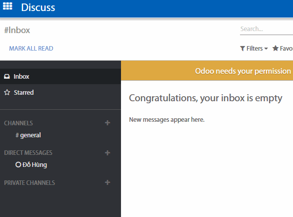 Sử dụng Inbox trong phân hệ Trao đổi (Discuss) để theo dõi cập nhật và tiến độ mọi công việc bạn làm trên phần mềm. Những thông báo và tin nhắn từ mọi thứ bạn theo dõi hoặc trong đó bạn được đề cập sẽ xuất hiện trong hộp thư đến của bạn.