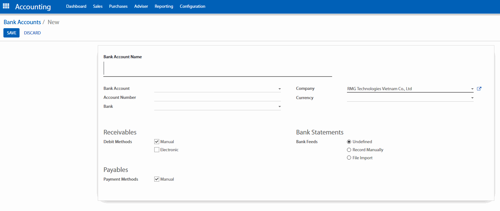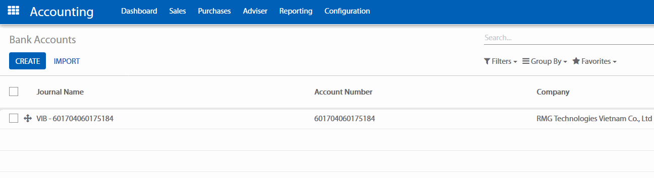 Đi đến hộp thoại Accounting (Kế toán) > Configuration (Cấu hình) > Bank Accounts (Tài khoản ngân hàng). Nhấp chuột vào Create (Tạo) và điền thông tin vào mẫu.