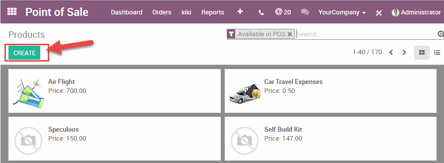 Để thêm sản phẩm từ bảng điều khiển Point of Sale (Điểm bán hàng), thực hiện như sau: