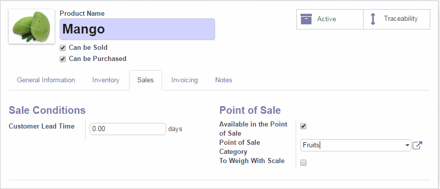 Ví dụ để thêm sản phẩm xoài có giá là 20$ / kg. Trong tab Sale (Bán hàng) bạn có thể thấy cấu hình điểm bán hàng. Ở đó bạn có thể thiết lập một danh mục sản phẩm xác định sản phẩm có trọng lượng hay không và đảm bảo rằng nó sẽ có sẵn trong điểm bán hàng. Sau đó nhấn Save (Lưu) để hoàn thành.