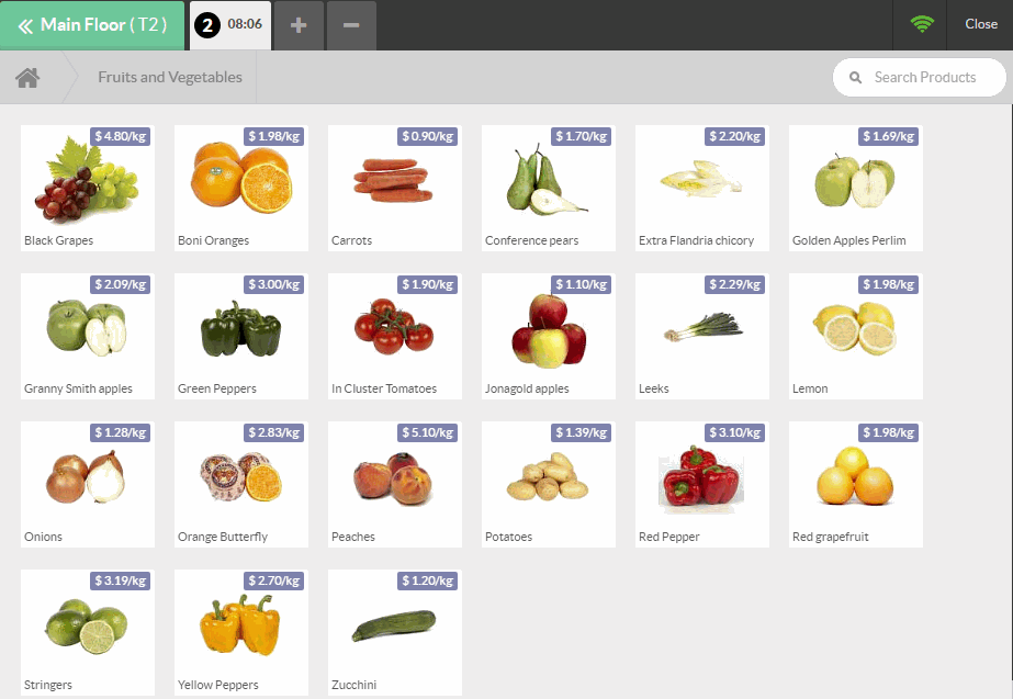 Trên giao diện ở phía bên phải là danh sách sản phẩm với danh mục sản phẩm ở phía trên. Nếu bạn nhấn vào một sản phẩm, sản phẩm đó sẽ được thêm vào giỏ hàng. Bạn có thể trực tiếp đặt lại số lượng hoặc trọng lượng cho sản phẩm được chọn bằng cách gõ từ bàn phím.