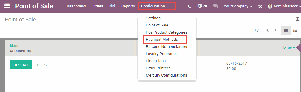 Chọn menu Configuration (Cấu hình) -> Payment methods (Phương thức thanh toán)