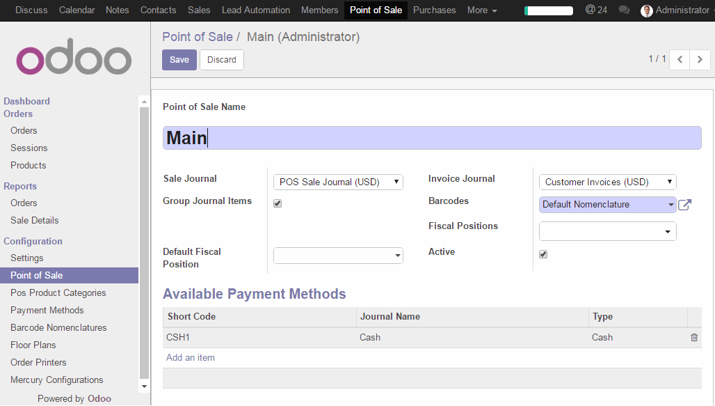 Sau khi thiết lập tên và loại cho phương thức bán hàng, bạn có thể vào tab Point Of Sale và đảm bảo rằng phương thức này đã được kích hoạt cho điểm bán hàng.