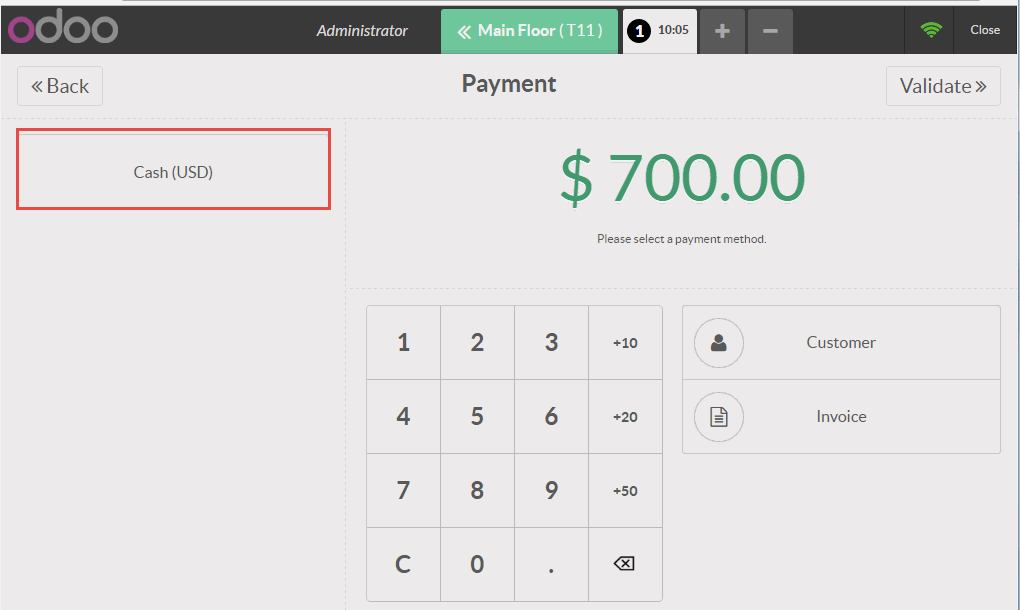 Trong ví dụ dưới đây khách hàng phải trả 23.5$, khách hàng đưa 30$, thối lại cho khách 6.5$ Sau khi hoàn thành nhấn vào Validate (Xác nhận). Phiếu thanh toán của bạn sẽ được in ra và sẵn sàng thực hiện tương tự cho đơn hàng tiếp theo.