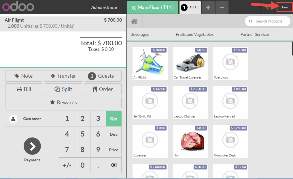 Vào cuối ngày để kết thúc phiên bán hàng nhấn vào nút Close (Đóng) ở góc trên bên phải