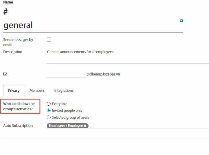 Bạn có thể cấu hình tên của kênh, mô tả, quyền truy cập, đăng ký tự động và gửi email qua kênh từ #channel-name > Settings. Thay đổi quyền truy cập kênh cho phép bạn kiểm soát những nhóm nào có thể xem từng kênh. Bạn có thể hiển thị kênh cho tất cả người dùng, người dùng được mời hoặc người dùng trong một nhóm người dùng đã chọn. Lưu ý rằng khi cho phép "Mọi người" theo dõi kênh cá nhân thì những người dùng khác xem và tham gia kênh đó vì khi đó nó sẽ là kênh công khai.