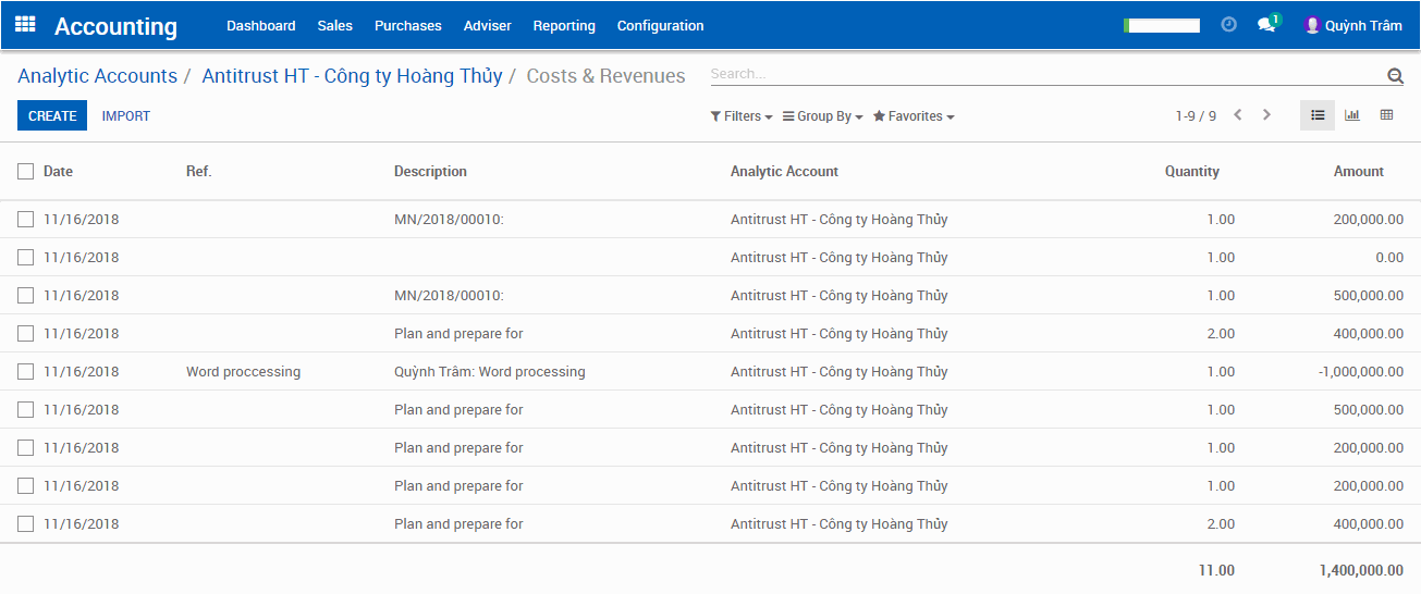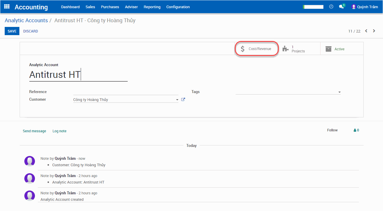 Tiếp đến chúng ta sẽ đi vào chi tiết các khoản thu chi theo vụ việc, tại “Analytic Account” click vào button “Cost/Revenue”.