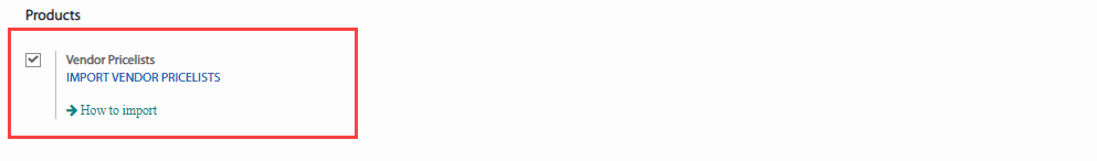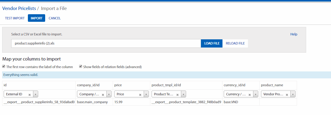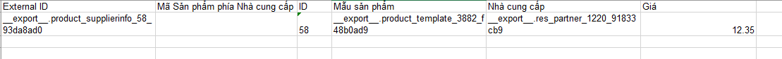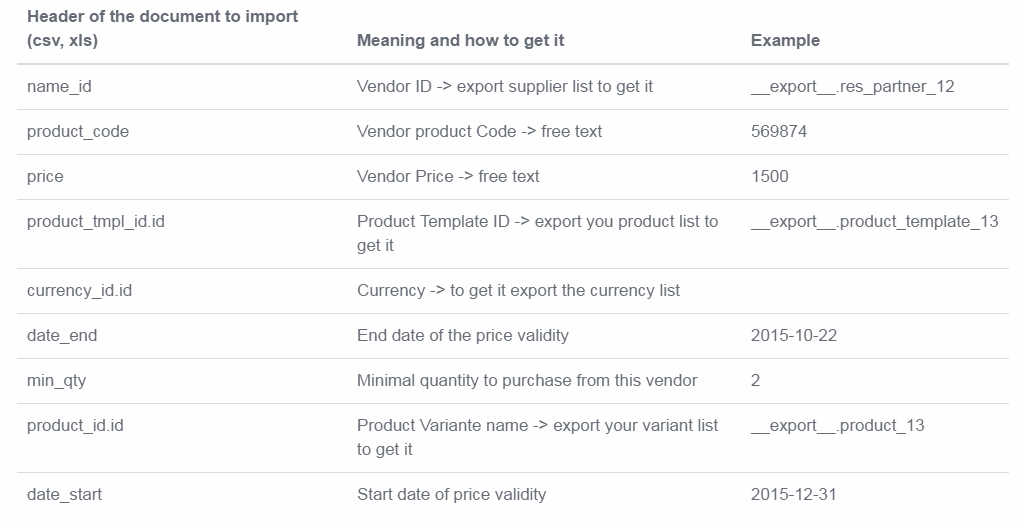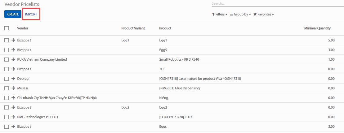 Trong Purchase (Mua hàng) > Purchase (Mua hàng) > Vendor Pricelists (Bảng giá Nhà cung cấp), xuất một biểu mẫu tài liệu để nhập hoặc xuất và lấy định dạng đúng để nhập với số lượng nhiều. Dùng phương pháp nhập tay để tạo dữ liệu và xuất chúng ra. (Select (Lựa chọn) > Action (Hành động) > Export (Xuất)