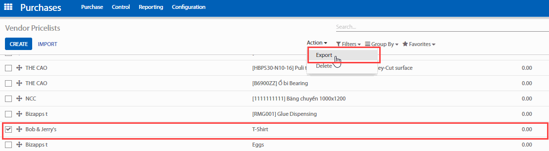 Làm theo quy trình của trường hợp đầu tiên để xuất dữ liệu có sẵn từ Purchases (Mua hàng) > Purchase (Mua hàng) > Vendor Pricelist (Bảng giá Nhà cung cấp). Chọn hết tất cả, từ menu Action (Hành động) > Export (Xuất).