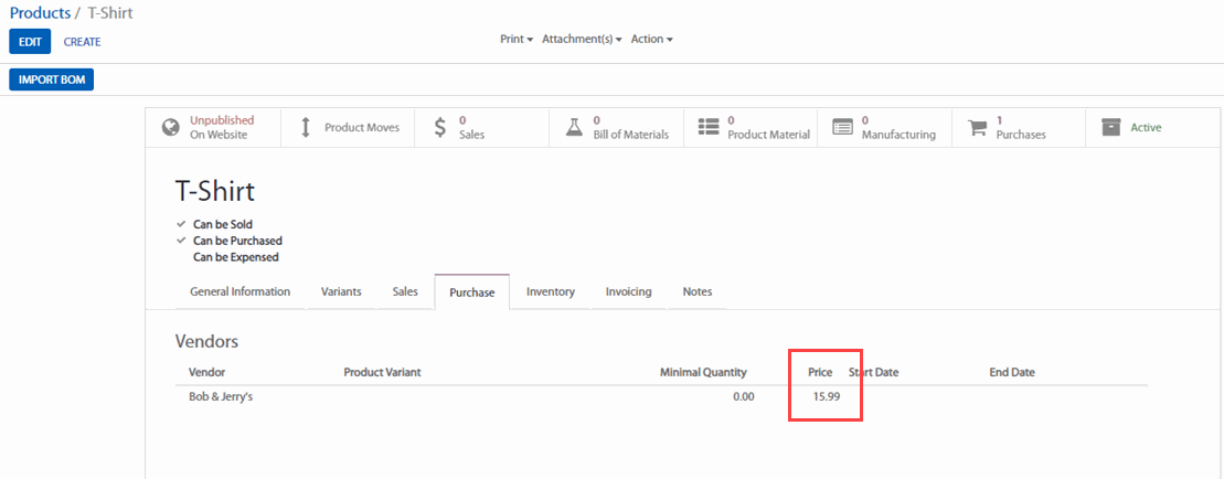 Sau khi nhập, mục Vendors (Nhà thầu) trong tab Inventory (Kho) của biểu mẫu sản phẩm sẽ được điền.