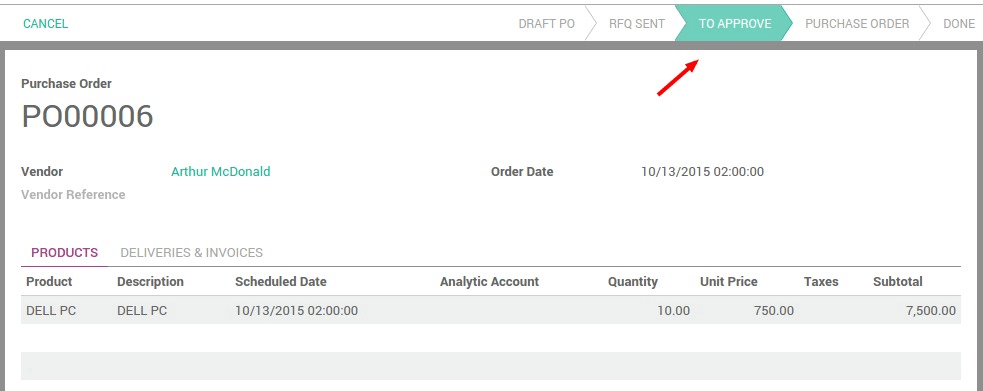 Đăng nhập với tư cách người dùng phân hệ Mua hàng, tạo đơn đặt hàng với số lượng nhiều hơn so với số lượng thiết lập ở trên và xác nhận. Đơn đặt hàng sẽ ở trạng thái To Approve. (Chờ duyệt)