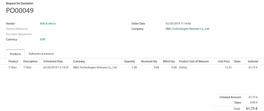 Chúng ta cùng lấy trường hợp sau đây làm ví dụ: Chúng ta cần mua 5 áo thun. Chúng ta có 1 nhà thầu cung ứng; được gọi là Bob&Jerry's và chúng ta muốn gửi một yêu cầu báo giá.