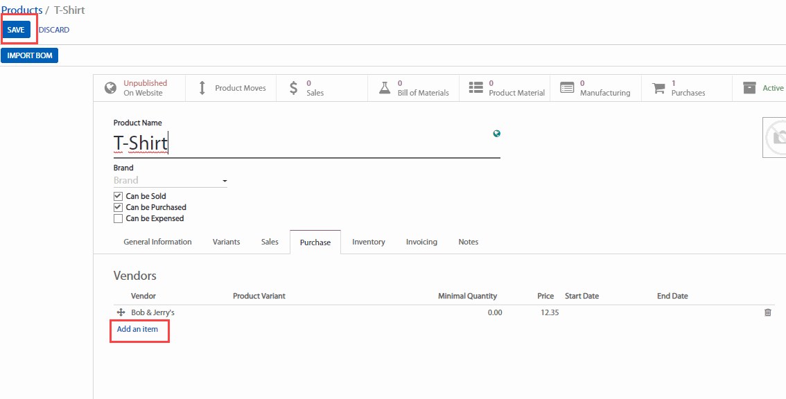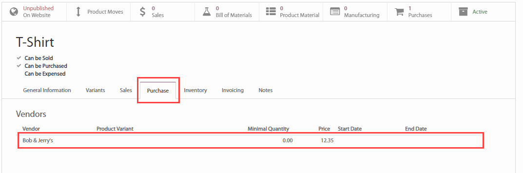 Khi chúng ta lưu và bắt đầu tính hiệu lực cho Đơn mua hàng thì nhà thầu cung ứng sẽ tự động được thêm vào danh sách các nhà cung cấp của sản phẩm. Để kiểm tra điều này, vào bước vào Mô-đun mua hàng, chọn Purchase (Mua hàng) > Products (Sản phẩm) và chọn sản phẩm áo thun. Bằng cách mở tab tồn kho chúng ta có thể nhận thấy rằng nhà cung cấp của chúng ta và giá cả của họ đã tự động được thêm vào.