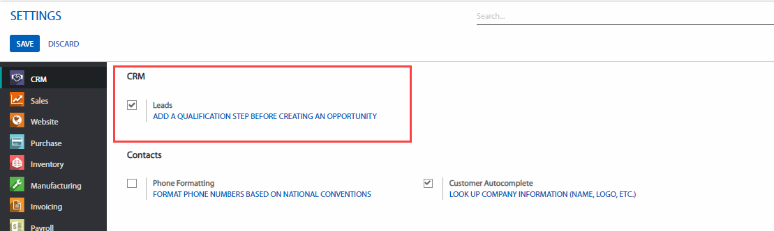 Theo mặc định, giai đoạn tiềm năng không được kích hoạt trong CRM của Phần mềm. Để kích hoạt nó bạn vào phân hệ CRM, chọn menu Configuration (Cấu hình) > Setting (Cài đặt) .Tìm và tích chọn vào ô check như hình dưới và nhấn SAVE (LƯU).