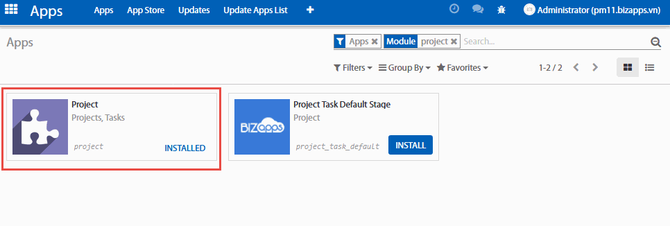 Thiết lập duy nhất bạn cần là cài đặt module Project (Quản lý dự án). Bạn đi tới menu Thiết lập, truy cập vào phần ứng dụng, tìm kiếm với từ khóa “project” trên thanh tìm kiếm và cài đặt ứng dụng.
