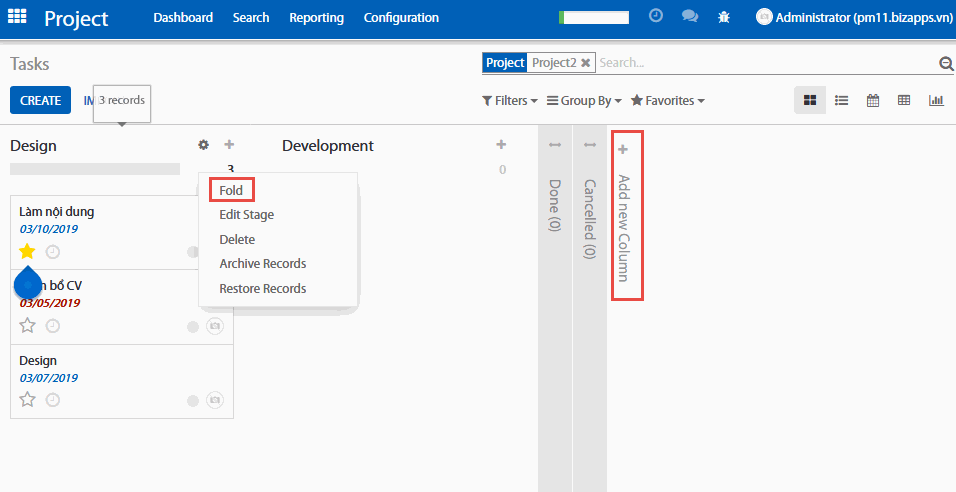 Bạn có thể dễ dàng tổ chức dự án cho phù hợp với thực tế công tác kinh doanh của doanh nghiệp bạn bằng cách tạo thêm những cột mới. Từ giao diện kanban của dự án, bạn có thể thêm một giai đoạn bằng cách lick vào Add new column (Thêm một cột). Nếu bạn muốn sắp xếp lại các giai đoạn của bạn, có có thể dễ dàng làm điều đó bằng cách kéo và thả các cột về vị trí bạn muốn. Bạn cũng có thể mở hoặc gấp lại các giao đoạn bằng cách sử dụng biểu tượng Fold (đóng gọn) bên trên mỗi cột