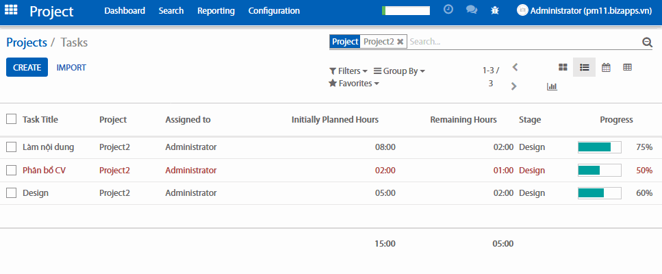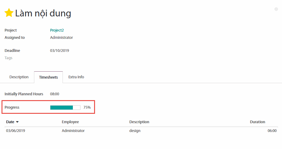 Tính năng này sẽ tạo ra một thanh tiến độ trong form giao diện của mỗi nhiệm vụ. Mỗi khi nhân viên của bạn thêm thời gian làm việc trong timesheets, các thanh tiến độ sẽ được cập nhật cho phù hợp dựa vào thời gian bạn lên kế hoạch ban đầu.