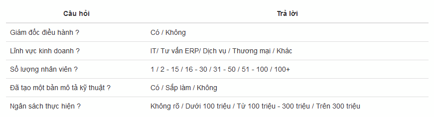 Khi phân hệ này được cài đặt bạn có thể tạo một vài câu hỏi thông qua menu Bán hàng -> Cấu hình -> Questionnaires. Với mỗi Câu hỏi (Questionnaire) hệ thống cho phép bạn tạo ra một danh sách các câu hỏi và câu trả lời thông qua menu Bán hàng -> Cấu hình -> Câu hỏi.