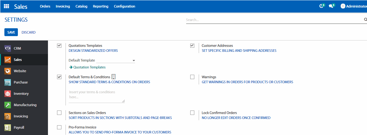 Điều kiện và điều khoản chung có thể thiết lập trong cấu hình bán hàng. Nội dung này sẽ tự động xuất hiện trong đơn bán hàng từ báo giá đến hóa đơn. Để xác định điều kiện và điều khoản của bạn vào Sales (Bán hàng) > Configuration (Cấu hình) > Settings (Thiết lập) > Tìm và check vào Default Terms & Conditions (Mặc định diều khoản và điều kiện) >Nhập nội dung điều khoản và chọn Save (Lưu) để áp dụng